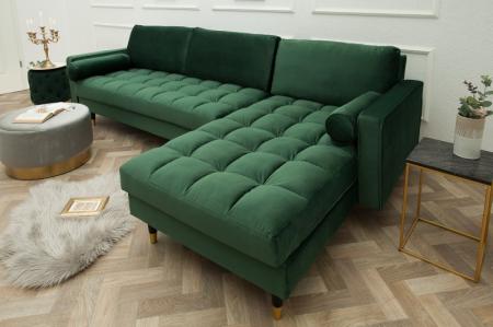 Moderná rohová sedačka z jemného zamatu vnesie exkluzivitu do vášho príbytku. Sedenie je čalúnené hebkým zamatom v kráľovskej tmavozelenej farbe. Husto vsadené gombíky do sedacej časti pridávajú na pohodlí a estetickej stránke sedačky. Operadlo a lakťová opierka sú tiež čalúnené zamatom. Podnož tejto sedačky tvoria úzke drevené nohy v tmavej farbe. Pohodlné ležanie pri sledovaní televízie vám spríjemní predĺžený otoman, na ktorý si môžete vystrieť unavené nohy. Súčasťou sedačky sú aj dva krásne vankúše v tmavozelenej farbe.